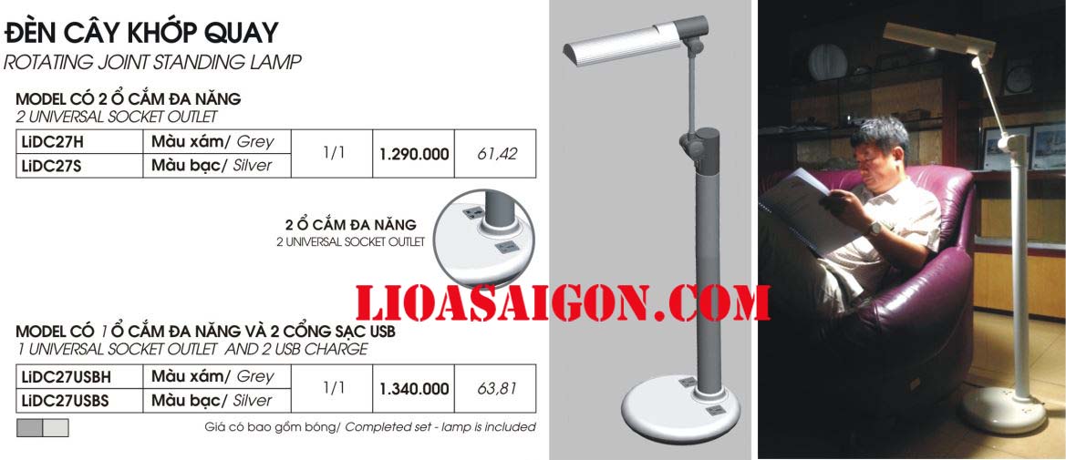 Đèn cây khớp quay Lioa Kiểu dáng sang trọng, hiện đại. Khớp mềm linh động điều chỉnh hướng. Tích hợp ổ 1 cắm đa năng và cổng sạc USB5V-1A. Tiện dụng cho học sinh, sinh viên, nhân viên văn phòng và các nhu cầu sử dụng khác...